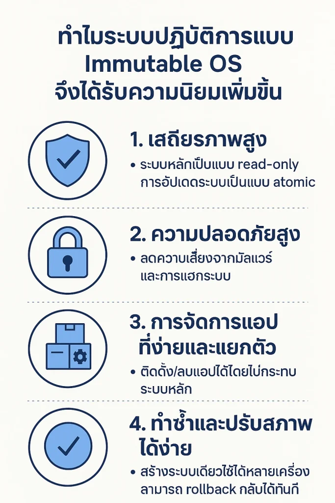 ในช่วงไม่กี่ปีที่ผ่านมา เป็นช่วงที่ระบบปฏิบัติการแบบ Immutable OS นั้นได้รับความนิยมเพิ่มขึ้นอย่างมาก โดยระบปฏิบัติการแบบนี้มีการทำงานสำคัญๆ คือ ไม่อนุญาตให้มีการเปลี่ยนแปลงใดๆ เลยในส่วนของ file...