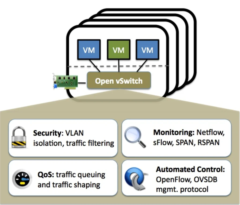 Open vSwitch นั้นเป็นซอฟต์แวร์ทำหน้าที่สวิตซ์แบบหลายเลเยอร์ ทำหน้าที่เช่นเดียวกับสวิตซ์แบบฮาร์ดแวร์ทุกอย่าง ซึ่งหลักๆ ก็คือหน้าที่แบบ forwarding รวมถึงหน้าที่ที่เกี่ยวข้อง และ การควบคุม มันทำงานได้ดีและเหมาะมากๆ กับสภาพแวดล้อมแบบ VM มันทำงานข้าม physical host ได้ และ ทำงานได้ดีกับ KVM หรือ Kernel Virtual Machine