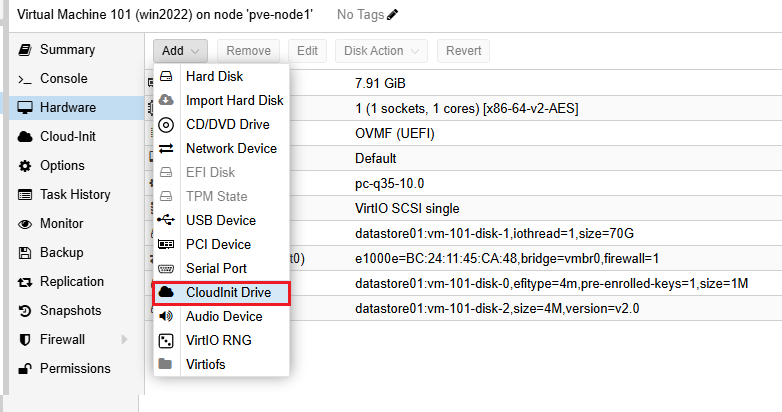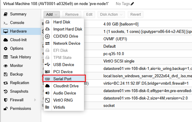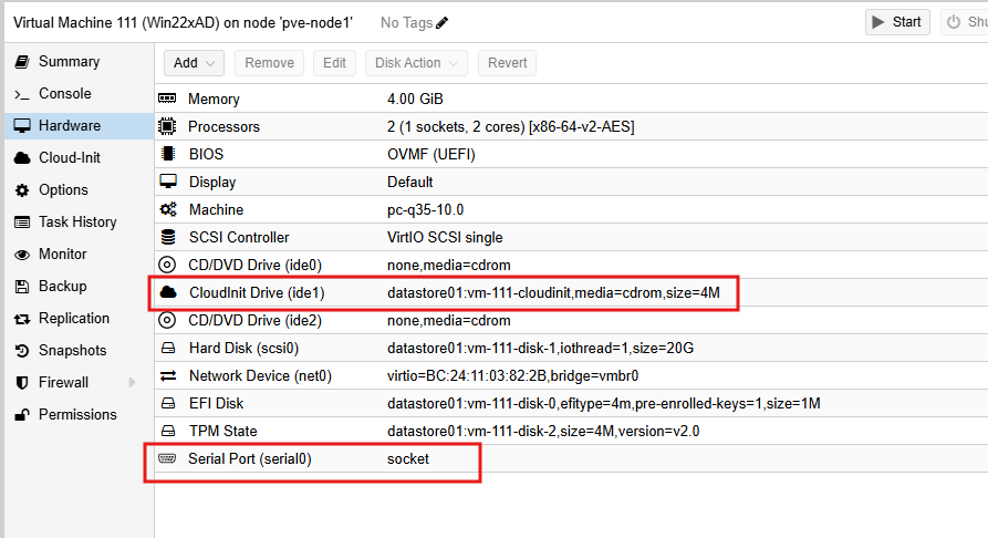 ตัวอย่างหลังจากการเพิ่ม Cloud-Init Drive และ Serial Port