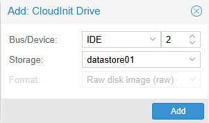 • เพิ่ม “Cloud-Init Drive”  ไปที่เมนู Hardware -> Add -> CloudInit Driveเลือก “Use local-lvm” หรือ “local” ตามที่เก็บ