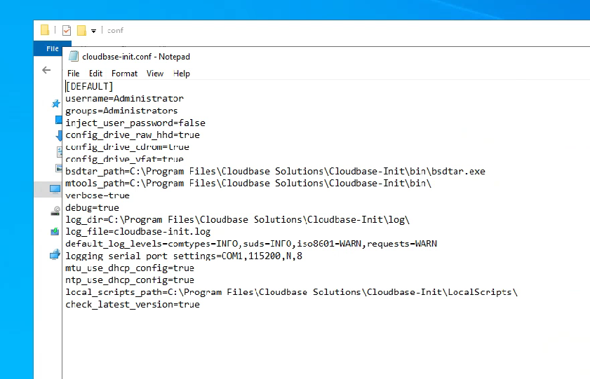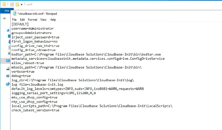 • เปิดไฟล์การตั้งค่า: C:\Program Files\Cloudbase Solutions\Cloudbase-Init\conf\cloudbase-init.conf