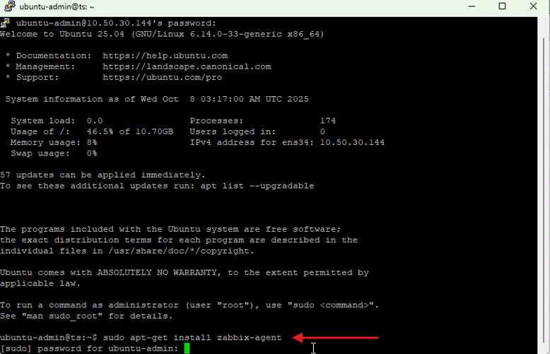 1. เปิด Terminal ของ Ubuntu Server ที่ต้องการเชื่อมต่อกับ zabbix ให้รันคำสั่งต่อไปนี้