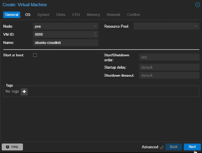 2. ตั้งชื่อ VM เช่น ubuntu-cloudinit-template