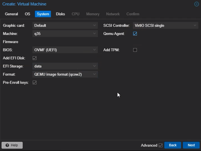 4. แท็ป  System กำหนด machine = q35 bios= uefi  และกำหนด EFI storage , format = qcow2 และเลือก qemu agent