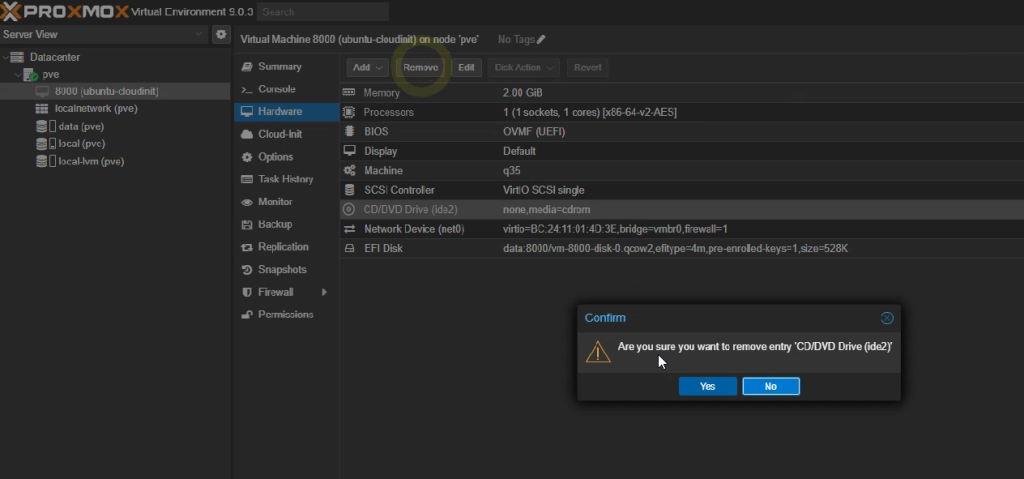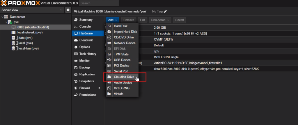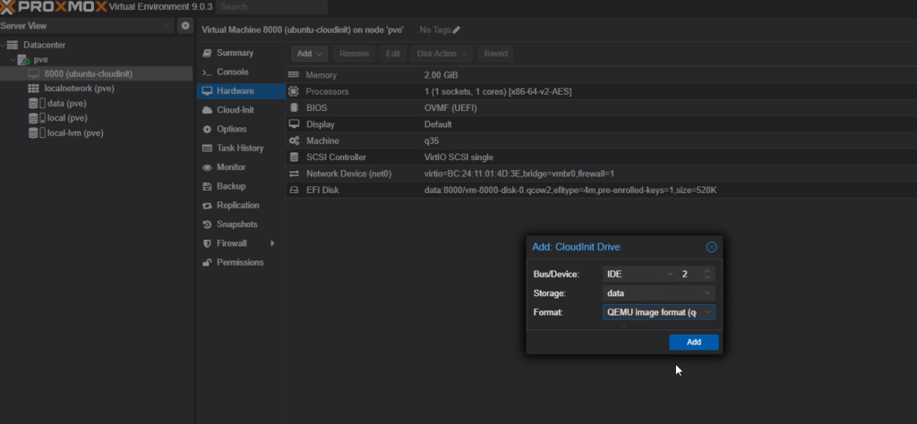 3. แนบไดรฟ์ cloud-init เพื่อให้ Proxmox