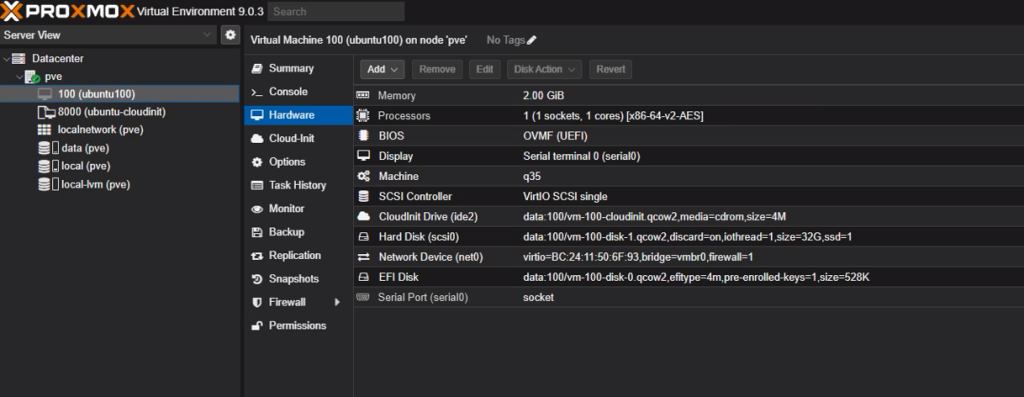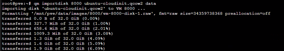 $ qm importdisk 8000 ubuntu-cloudinit.qcow2 local