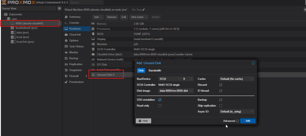 17. กลับไปที่ VM Cloud-init  จะเจอ Unusde disk 0 เลือก Edit เลือก Discard, เลือกSSD Emulation กด Add