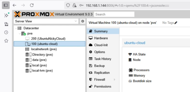 $ qm create 100 --name ubuntu-cloud --memory 1024--cores 2 --net0 virtio,bridge=vmbr0,tag=149