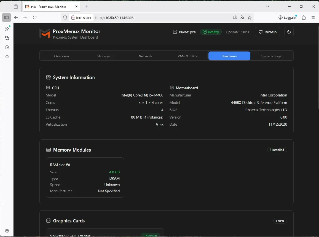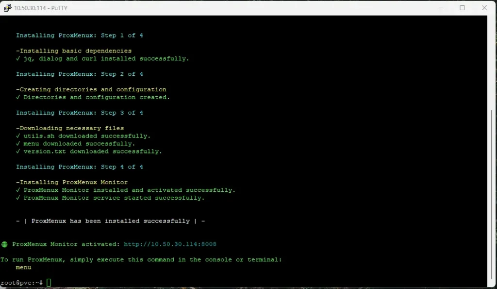 เมื่อเสร็จท่านจะกลับมาที่เครื่องหมาย prompt หลังจากนั้นให้ท่านใช้เบราเซอร์ผ่าน IP ของ Proxmox VE ที่ท่านติดตั้ง ProxMenux ไว้ด้วยพอร์ต 8008 เช่น